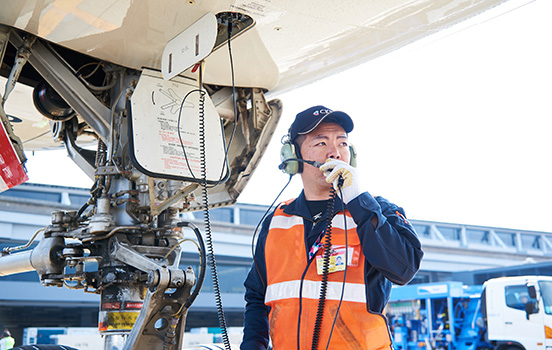 コックピットと交信をし、離発着時の航空機誘導を行う